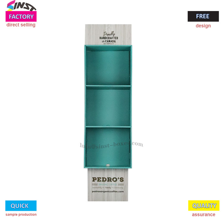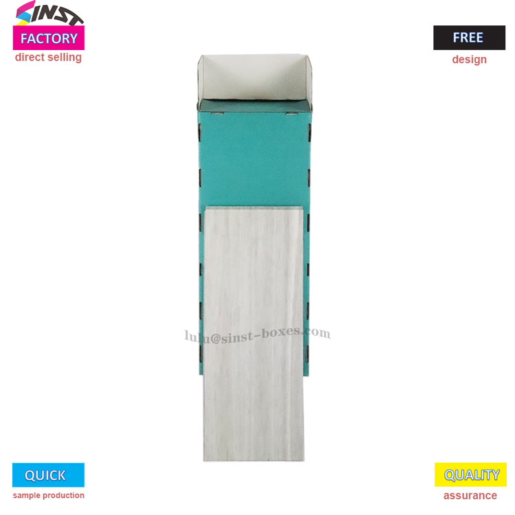 Ce présentoir ondulé de papeterie est principalement utilisé pour afficher divers articles de papeterie. Le corps global est de forme rectangulaire et est fait de bois clair ou d'un matériau à grain de bois imitation blanc, qui semble rafraîchissant et texturé. Trois compartiments de rangement ouverts ont été spécialement conçus en façade, de coloris vert ou bleu-vert, parfaits pour trier et ranger la papeterie. Qu'il s'agisse de livres, de cahiers divers ou de stylos de différents styles, ils peuvent tous être placés en toute sécurité à l'intérieur. De plus, ce présentoir a une structure trapézoïdale légèrement inclinée vers l'avant, ce qui facilite l'accès et le placement d'objets sans trop d'effort.