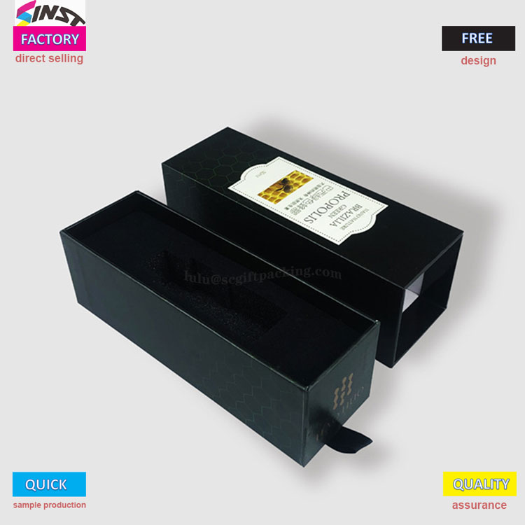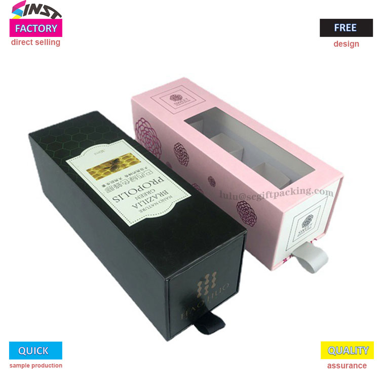 Cet emballage cadeau glissant de tiroir rigide de luxe pour l'huile essentielle comprend une conception compartimentée et des fenêtres transparentes qui permettent une visibilité claire des quatre compartiments à l'intérieur de la boîte sans avoir besoin d'ouvrir le couvercle; Lorsque les doubles boîtes noires et roses sont placées côte à côte, l'ingéniosité de la conception peut être vue: la boîte noire a des lettres d'or embellies sur le corps pour un look plus texturé, et l'anneau de traction noir sur le côté peut être facilement ouvert; Le modèle rose conserve une fenêtre transparente, qui peut voir directement le réservoir spécial pour l'échantillon d'essence - essai de lotion, 10 ml d'essence enveloppé étroitement. Des échantillons d'essence aux outils, la division est claire et non mélangée.