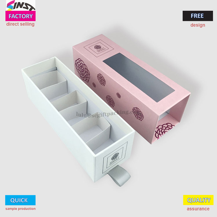 L'emballage cadeau glissant de tiroir rigide de luxe pour l'huile essentielle est conçu comme une boîte cadeau en deux couleurs, avec une collision de couleurs roses et noires pour créer une sensation simple et luxueuse - la boîte rose est ornée de motifs de fleurs violets profonds / violets, et est livré avec une fenêtre transparente pour une vue directe du contenu; La doublure intérieure présente un diviseur blanc et une conception d'onglet de traction, permettant une extraction facile avec juste une traction douce. Cinq compartiments séparés sont disponibles pour stocker des bijoux, des échantillons de beauté ou des bouteilles de propolis de 30 ml, en garantissant un environnement propre et sans inquiétude. Peut être utilisé comme boîte-cadeau adhésif en vernis à ongles, boîte cadeau à rouge à lèvres, échantillon de boîte cadeau, etc.