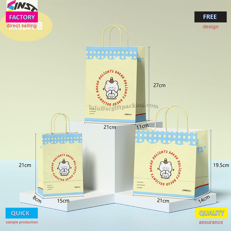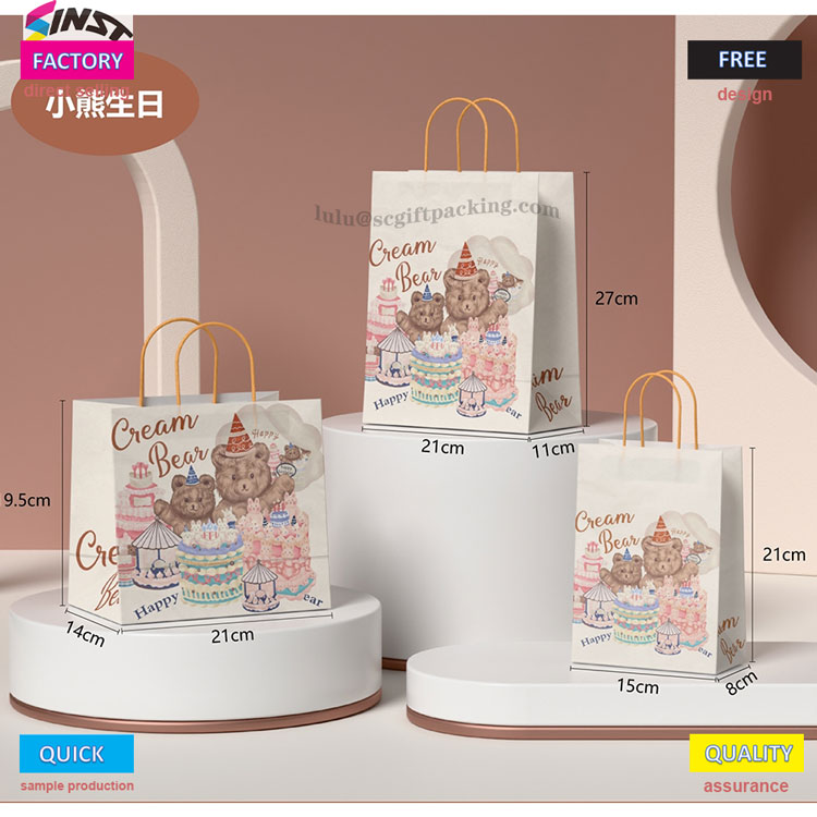Récemment,Sinst Packaging Company a lancé un sac cadeauavec le thème de "Bear Birthday". Le sac est imprimé avec des motifs d'ours et de gâteaux dessinés à la main, associés à une corde à poignée jaune chaude, qui non seulement conserve la texture respectueuse de l'environnement du sac en papier, mais transmet également l'atmosphère d'anniversaire à travers des couleurs vives. Ce sac convient à divers cadeaux tels que les gâteaux aux œufs, les jouets, les coffrets cadeaux, etc., qu'il s'agisse d'un magasin de rassemblement ou de vente au détail de famille, il peut répondre aux besoins d'emballage de base.