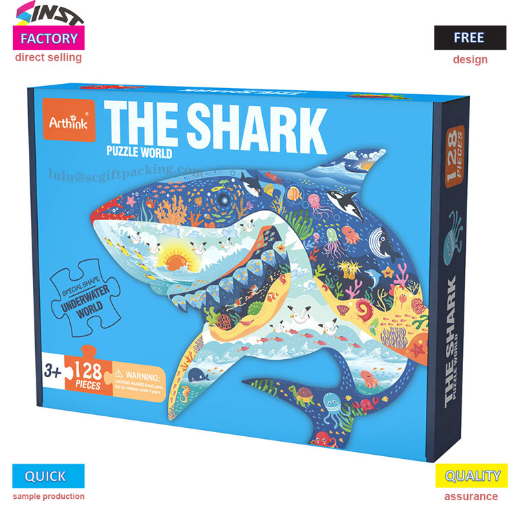 La semaine dernière, j'ai rencontré Zhang Jie dans le hall d'exposition. Elle tenait le requincoffret cadeau puzzle" En regardant dans la direction qu'elle a indiquée, le requin sur le coffret cadeau bleu était couvert de petits poissons corail sur tout son corps, et après avoir assemblé 128 pièces de puzzle, il ressemblait à un " roi sous-marin " nageant - c'est notre nouveau THE SHARK PUZZLE WORLD, qui est également le coffret cadeau extraterrestre coloré sur la photo.
