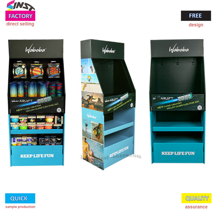 Le corps principal du présentoir de jouets pour enfants est bleu-vert avec des illustrations de scènes de jeu de personnages, et le slogan « KEEP LIFE FUN » en bas transmet le concept central de « s'amuser ». Associé à un design ouvert en couches, les enfants sont immédiatement attirés par la scène et peuvent facilement dessiner et essayer des planeurs et des frisbees ; Les parents peuvent facilement reconnaître « ce jouet peut apporter du bonheur » en lisant des slogans et en identifiant des marques.